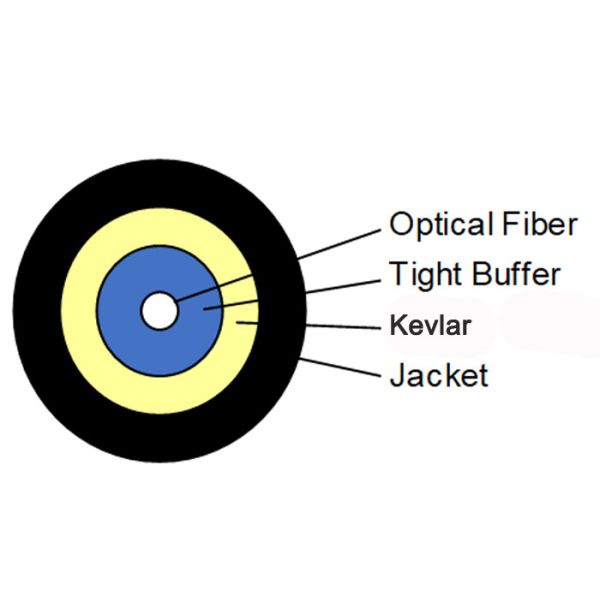 Simplex cable uses single tight buffer fiber as optical communication medium, tight buffer fiber wrapped with a layer of aramid yarns as strength member and the cable is completed with TPU jacket.